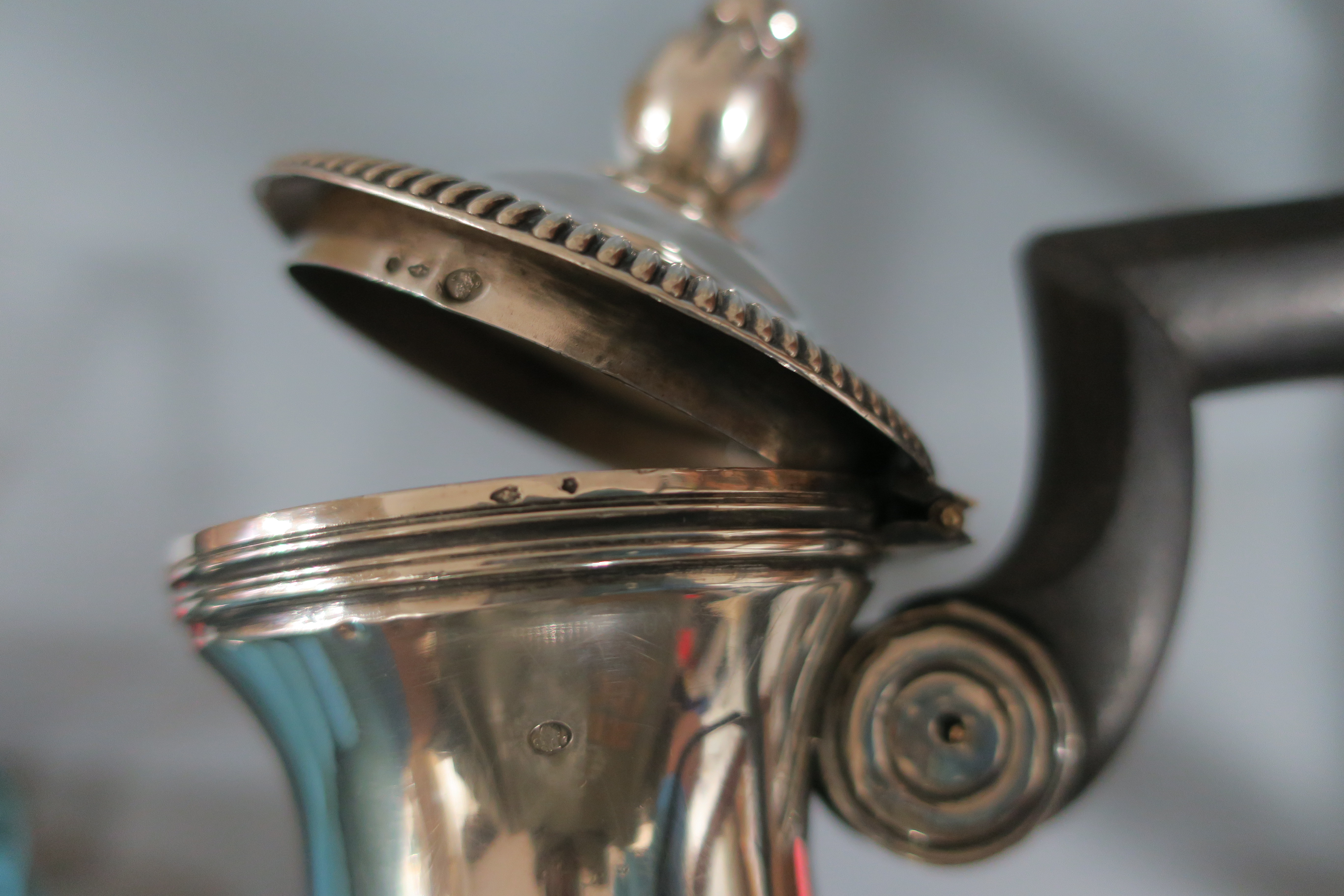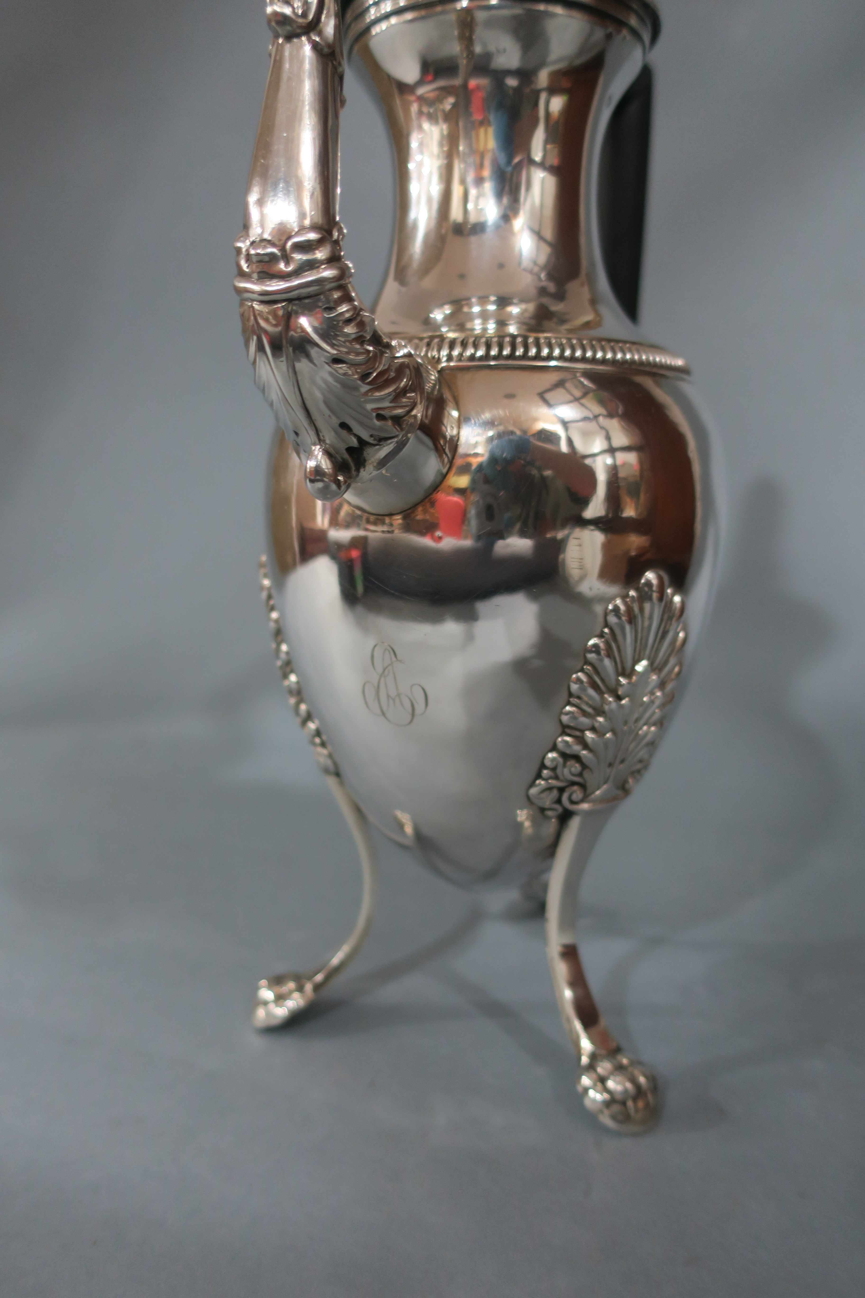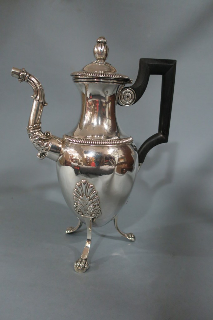 Théière en argent 800/1000 reposant sur trois pieds en forme de pattes de lion surmontés de palmettes, anse en ébène. Chiffrée « AT » sur la panse.
