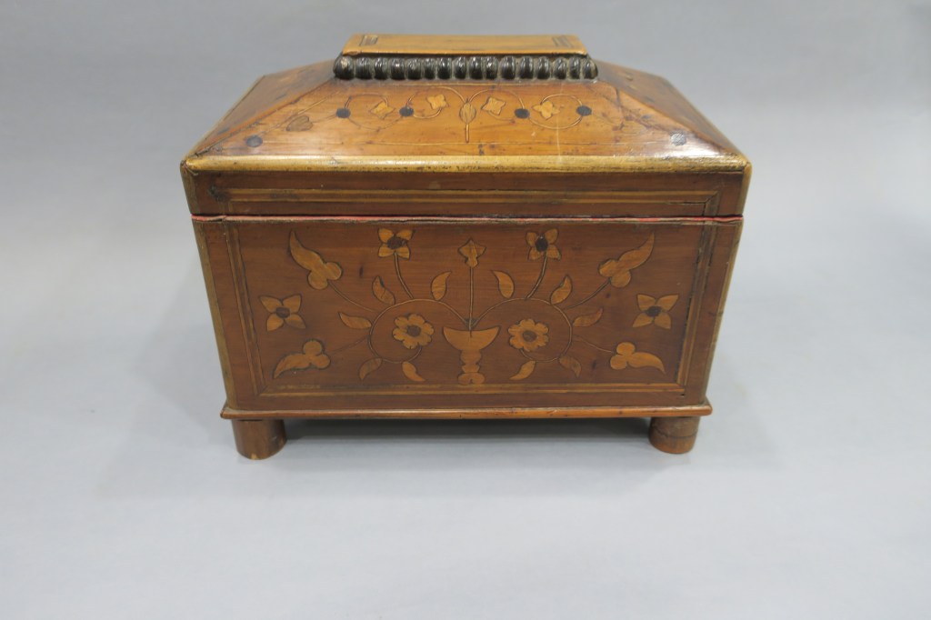 Coffret à thé rectangulaire à pans coupés en bois marqueté de fleurs. L’intérieur découvre trois compartiments.
