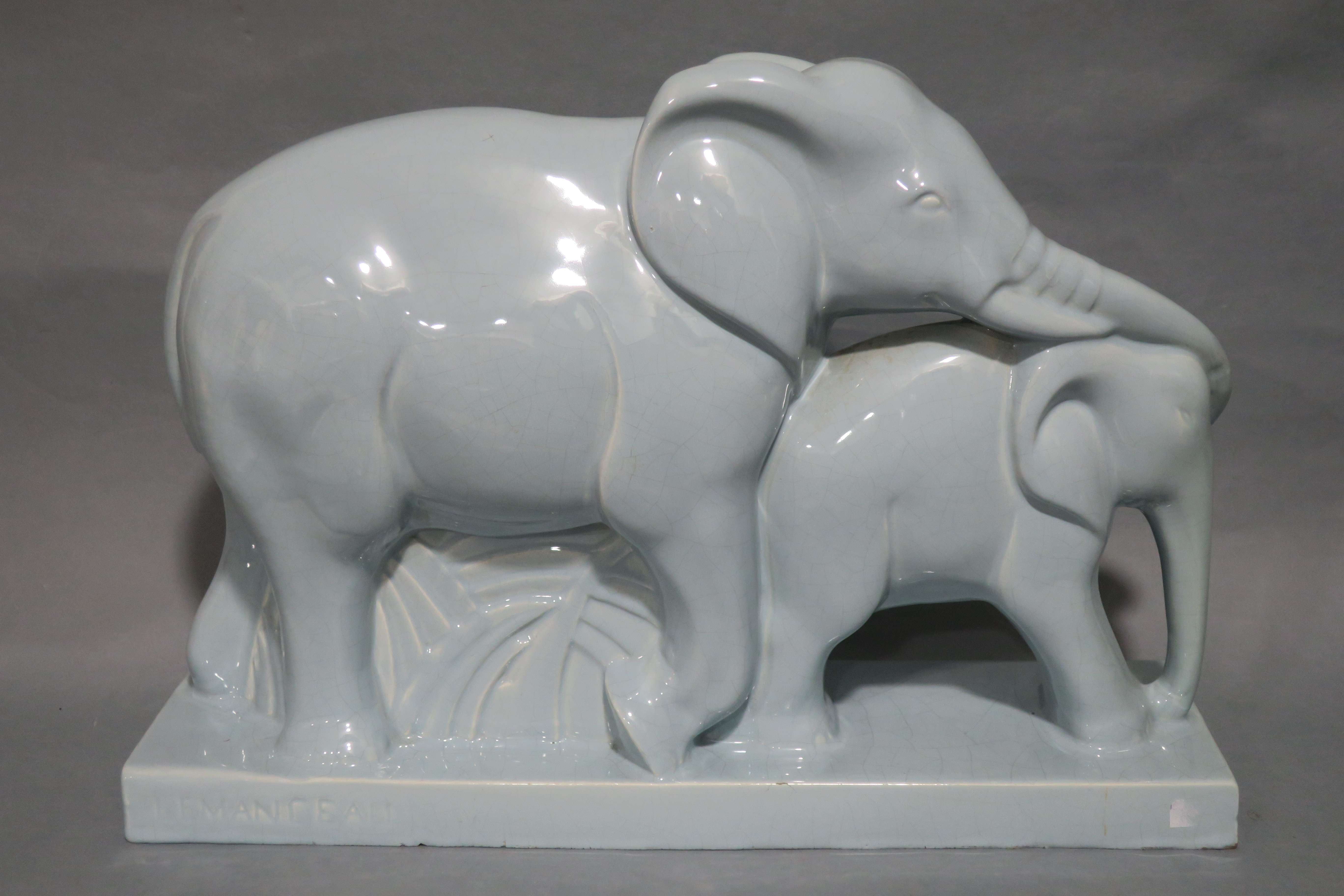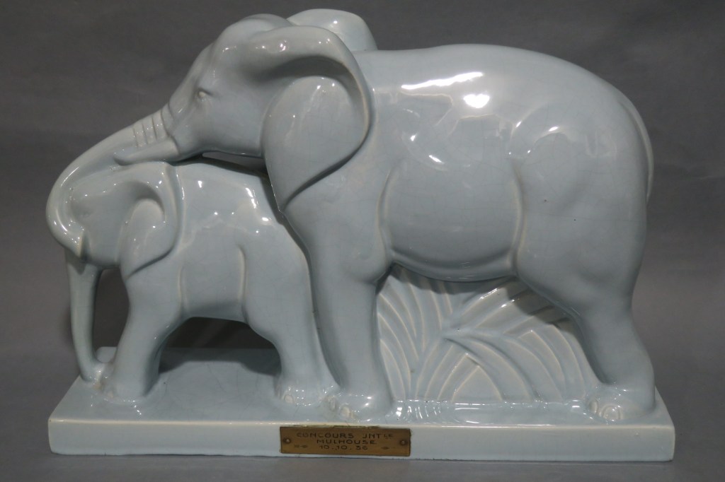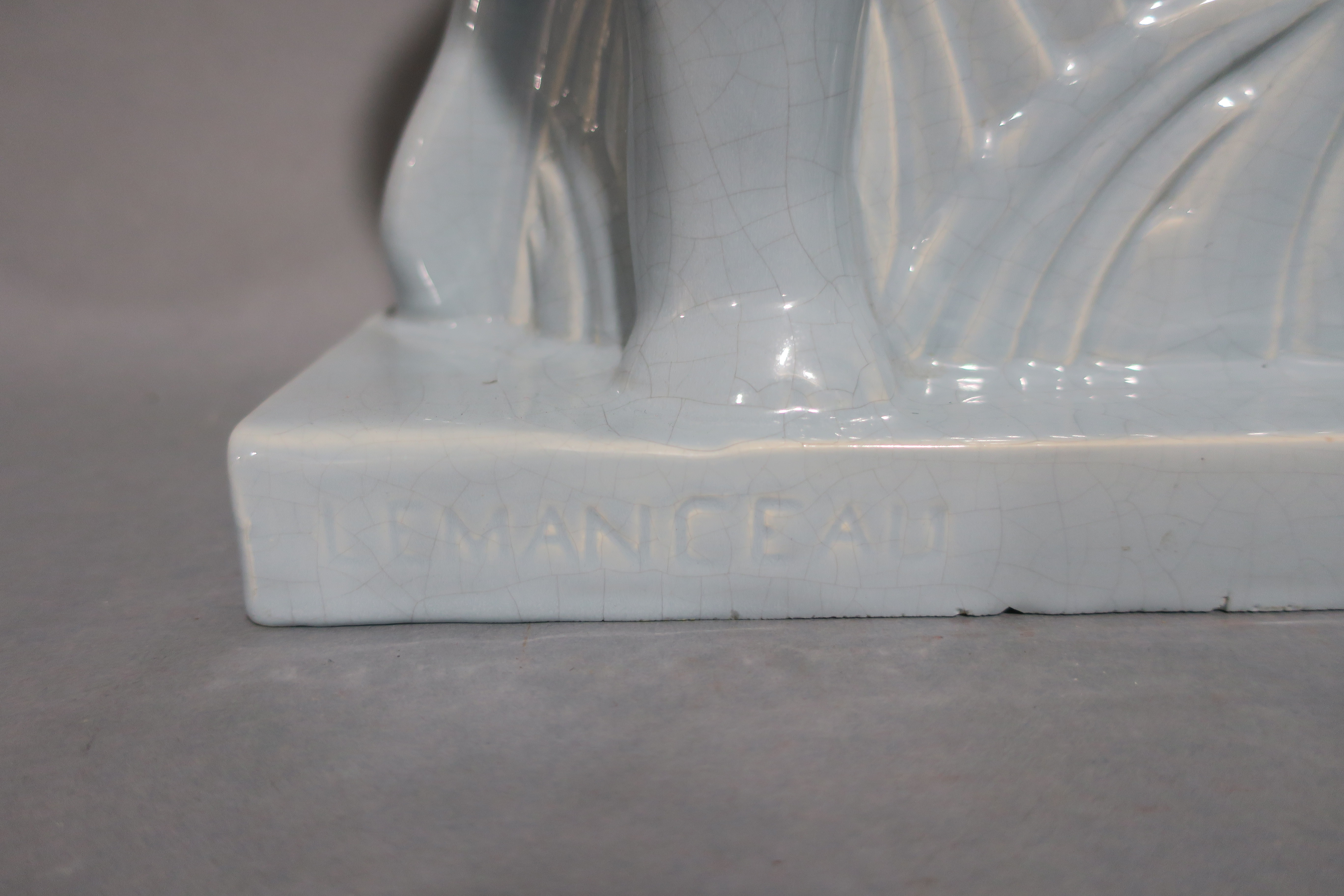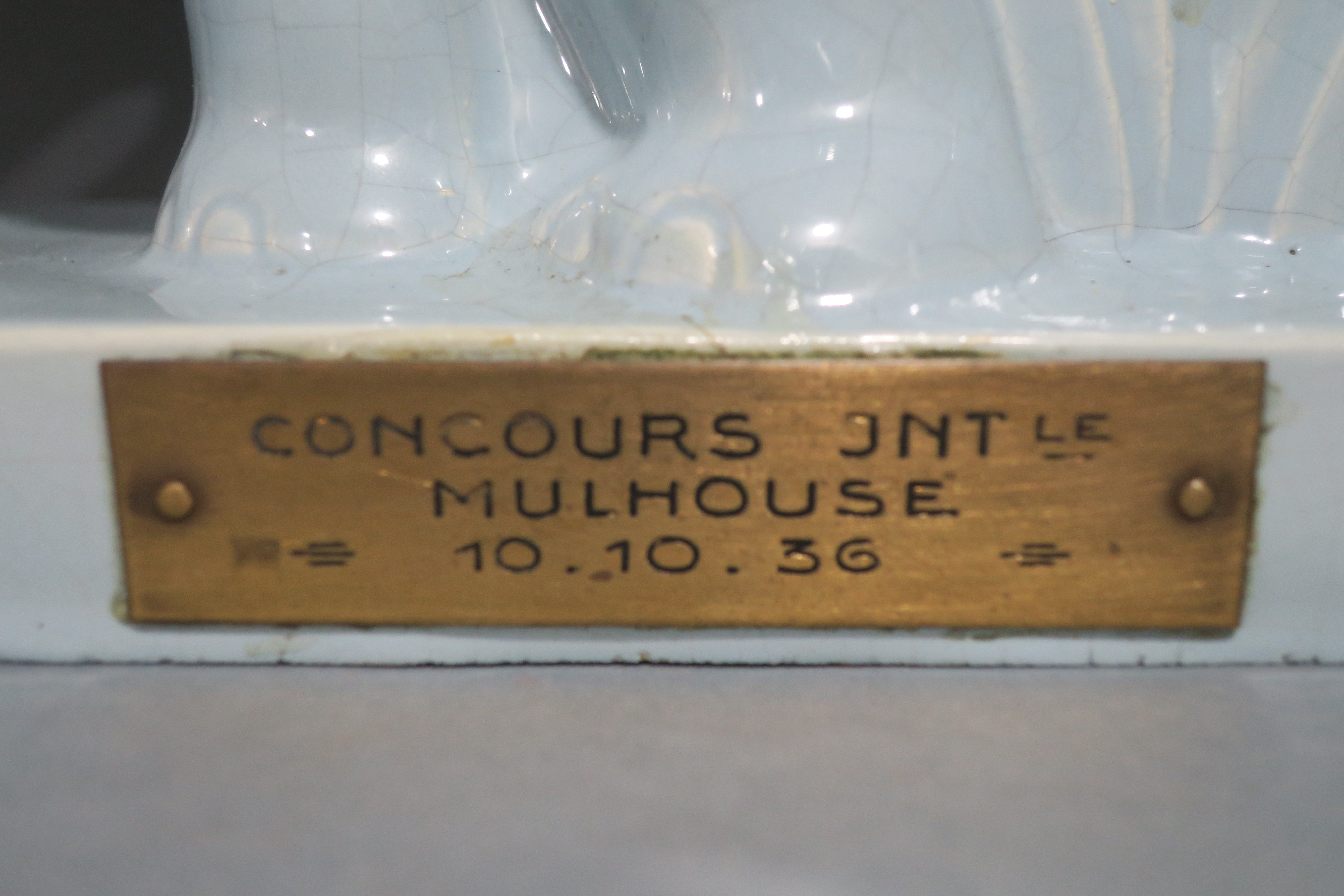 Sujet en faïence craquelée bleue ciel Art Déco. Porte une plaque « Concours international Mulhouse 10.10.1936 ». Signé sur la terrasse.
