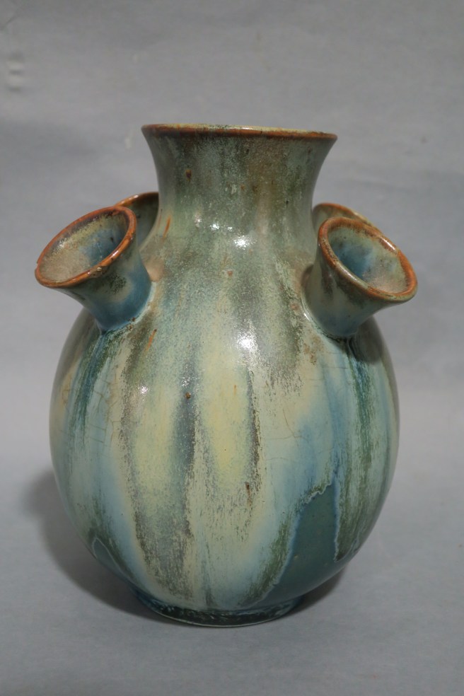 Notre bouquetière, en grès flammé dans les tons bleu-vert, est typique des productions de Charles Greber, à qui nous l’attribuons.