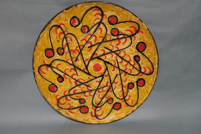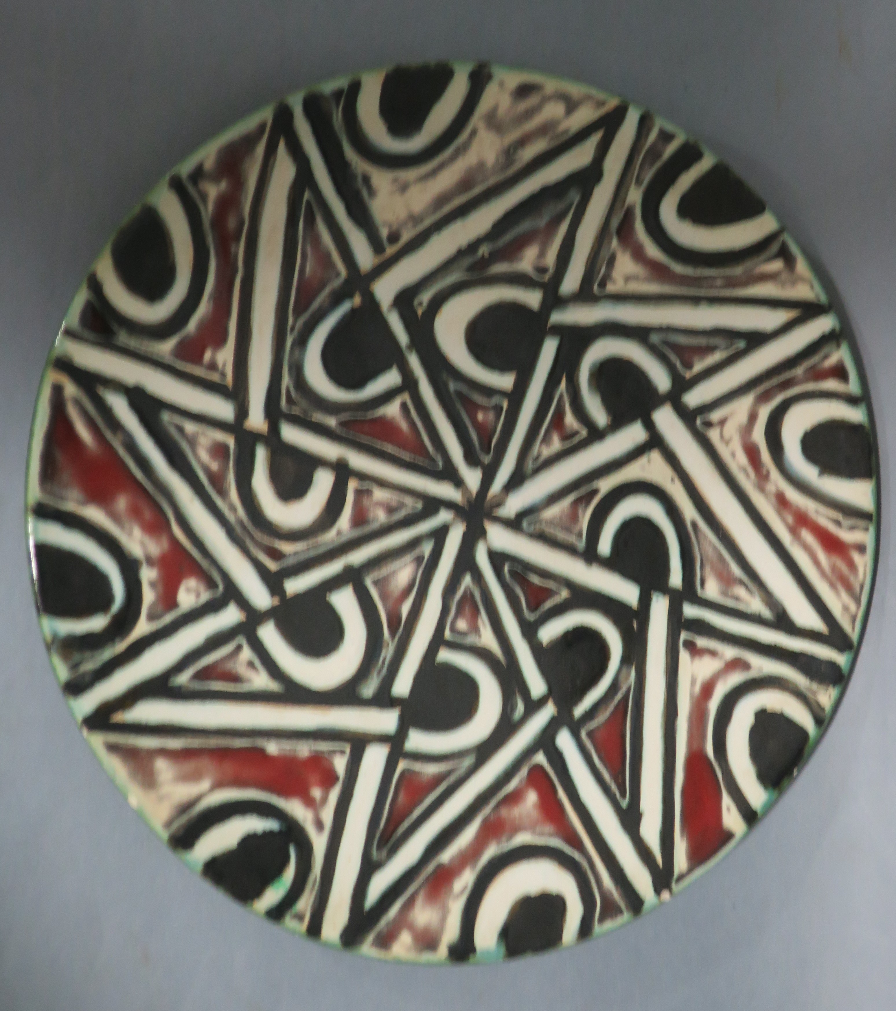 En 1933, Charles cède l’entreprise à son neveu Pierre (1896-1965). Il la dirige jusqu’en 1961, date de fermeture faute de repreneur. Pierre Greber produit essentiellement des pièces en grès émaillé de couleurs vives et brillantes et se spécialise dans la vaisselle d’usage courant. Le plat et l’assiette à décor géométrique que nous vous proposons font partie de cette production.
