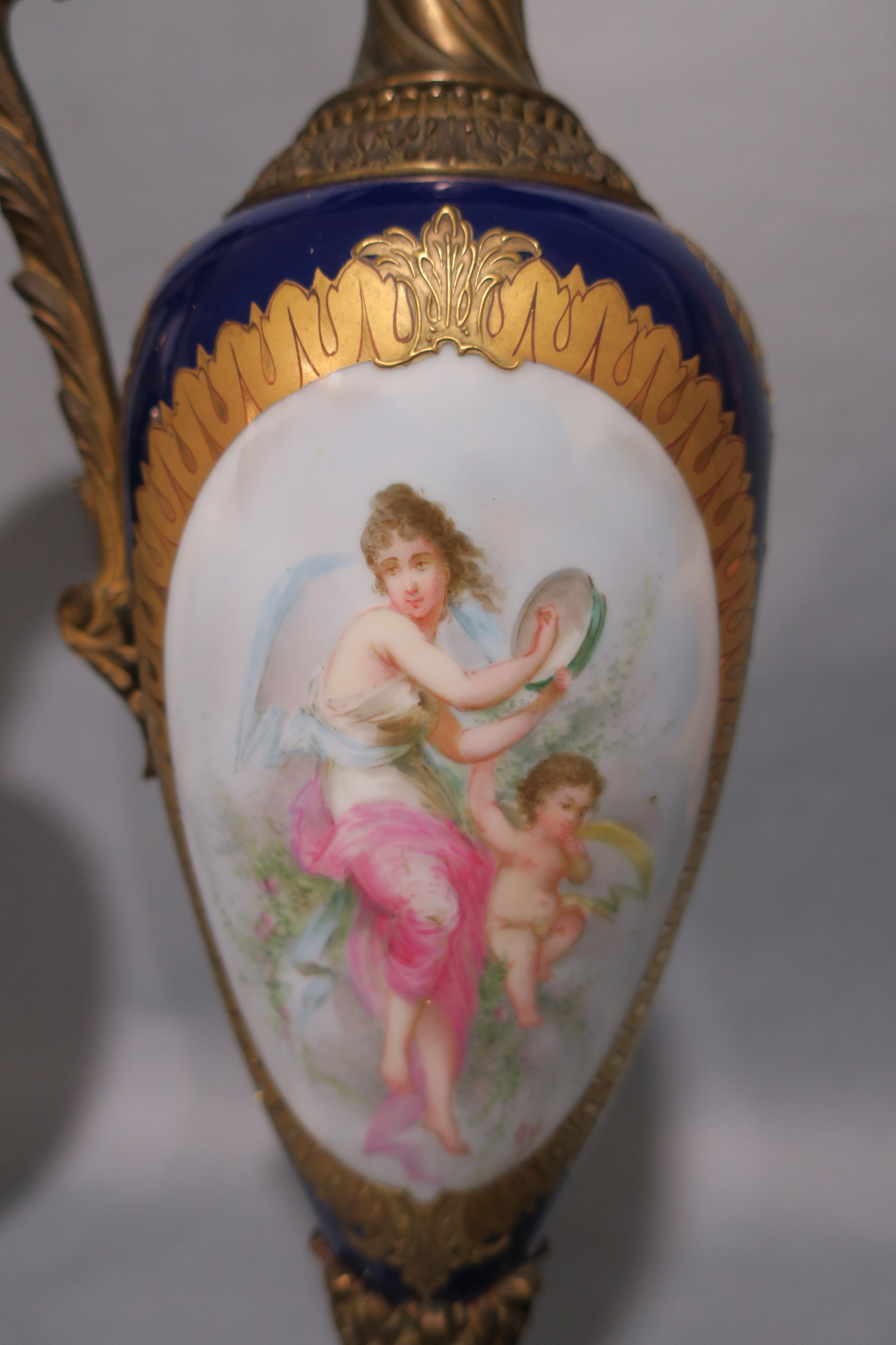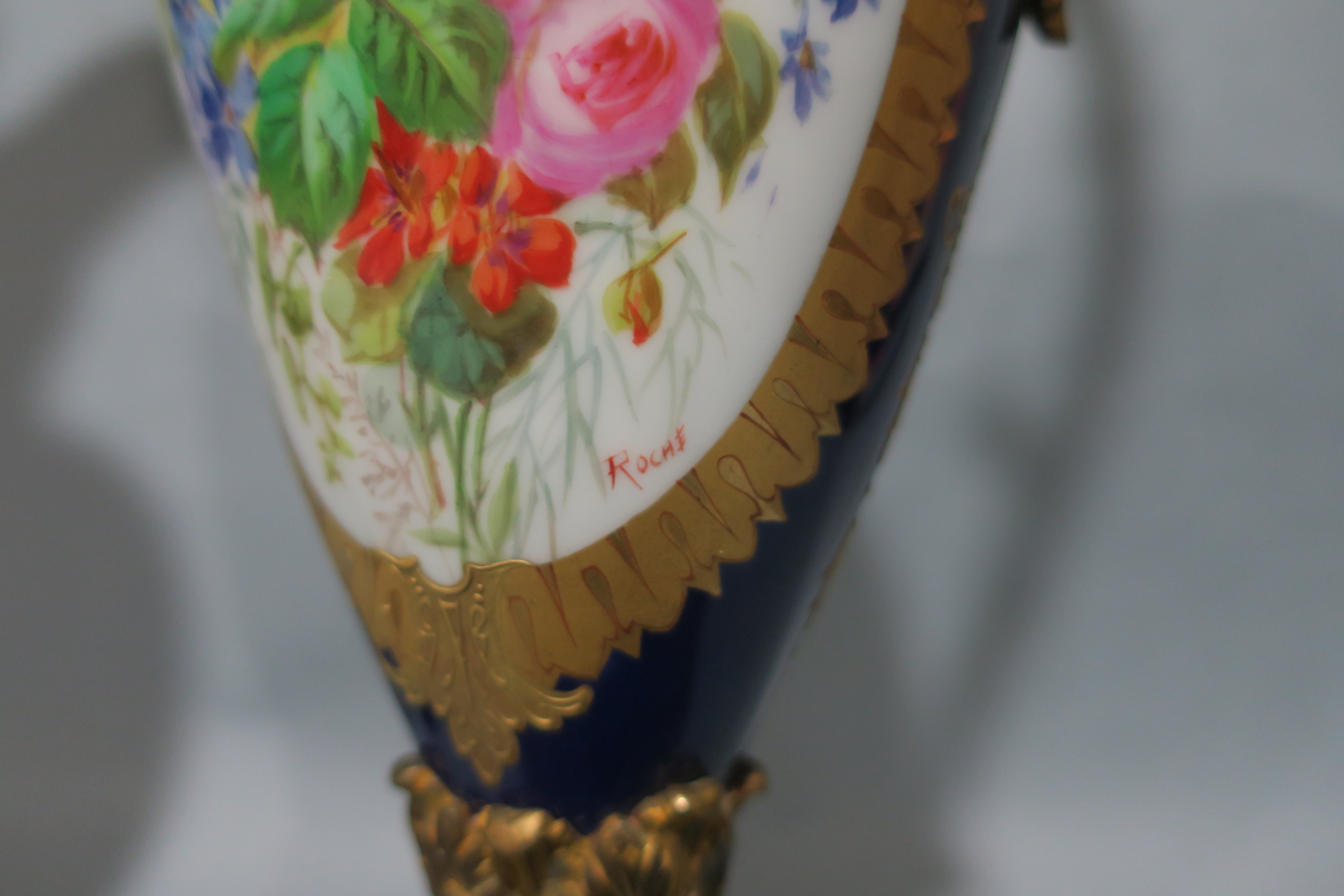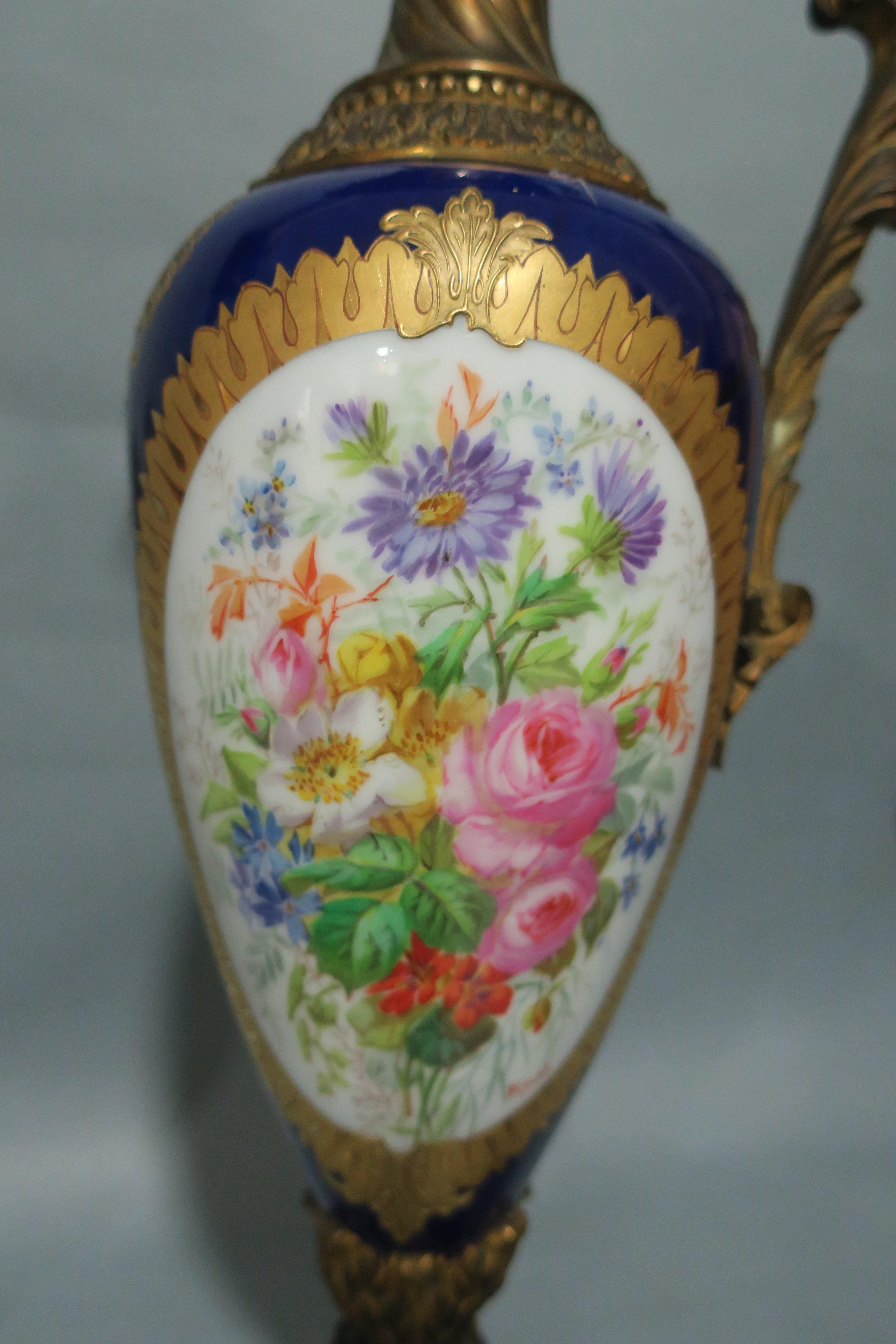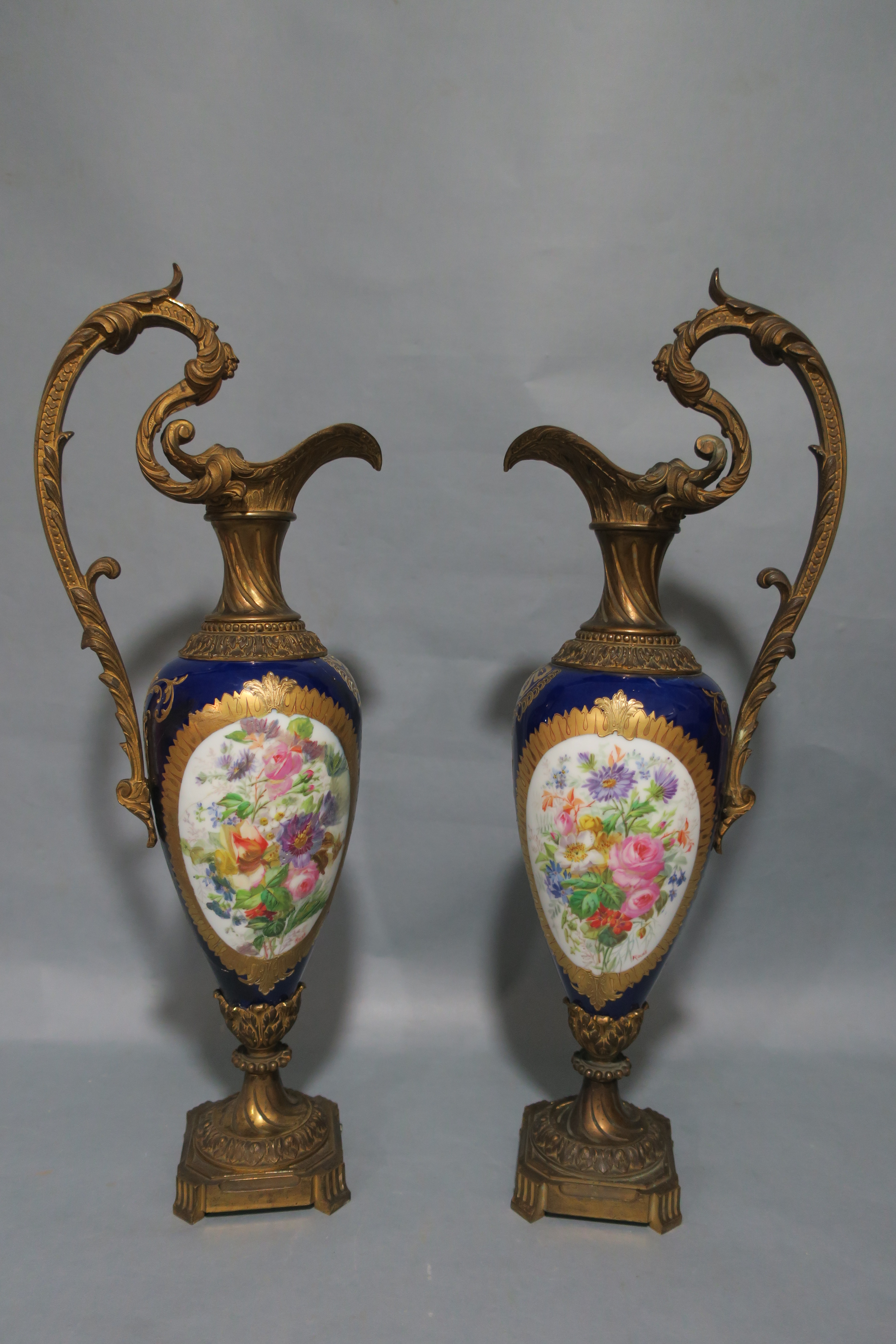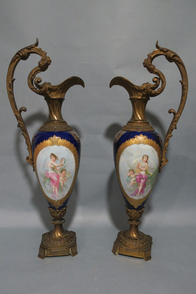 Paire d’aiguières en porcelaine à décor d’allégories de la musique sur une face et de bouquets de fleurs sur l’autre face, monture bronze. Décors signés « Roche ».
