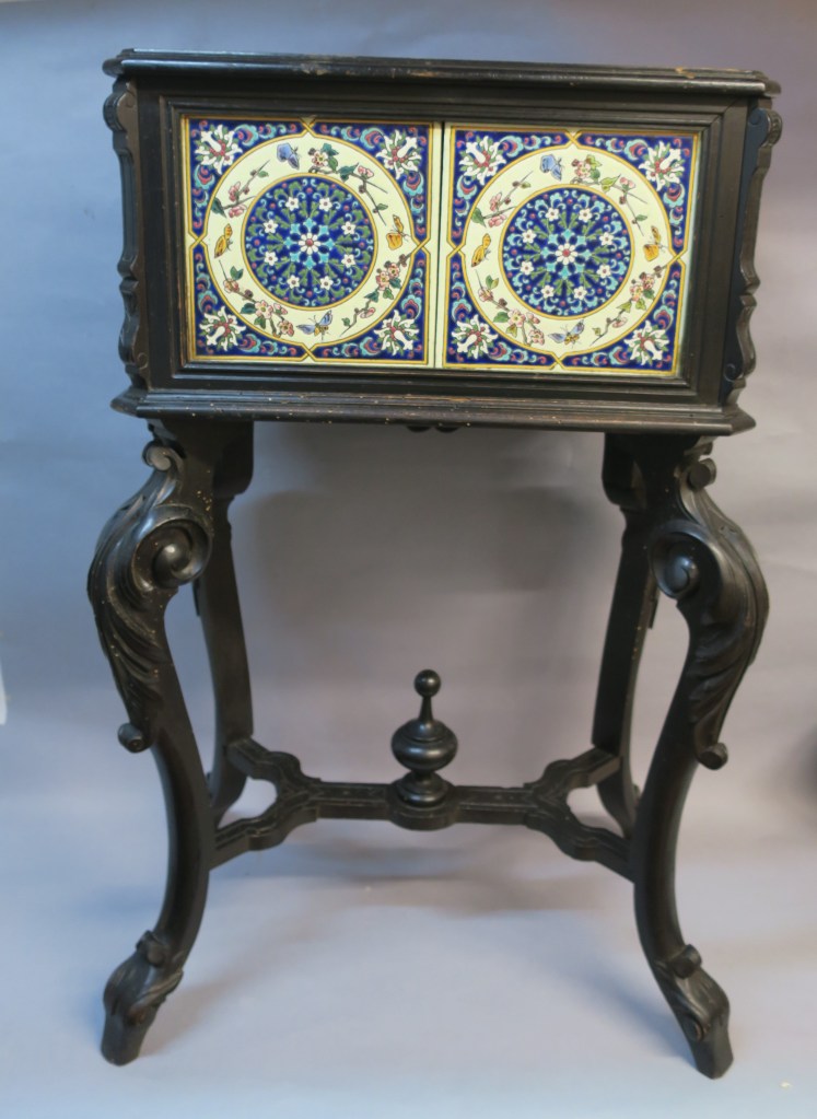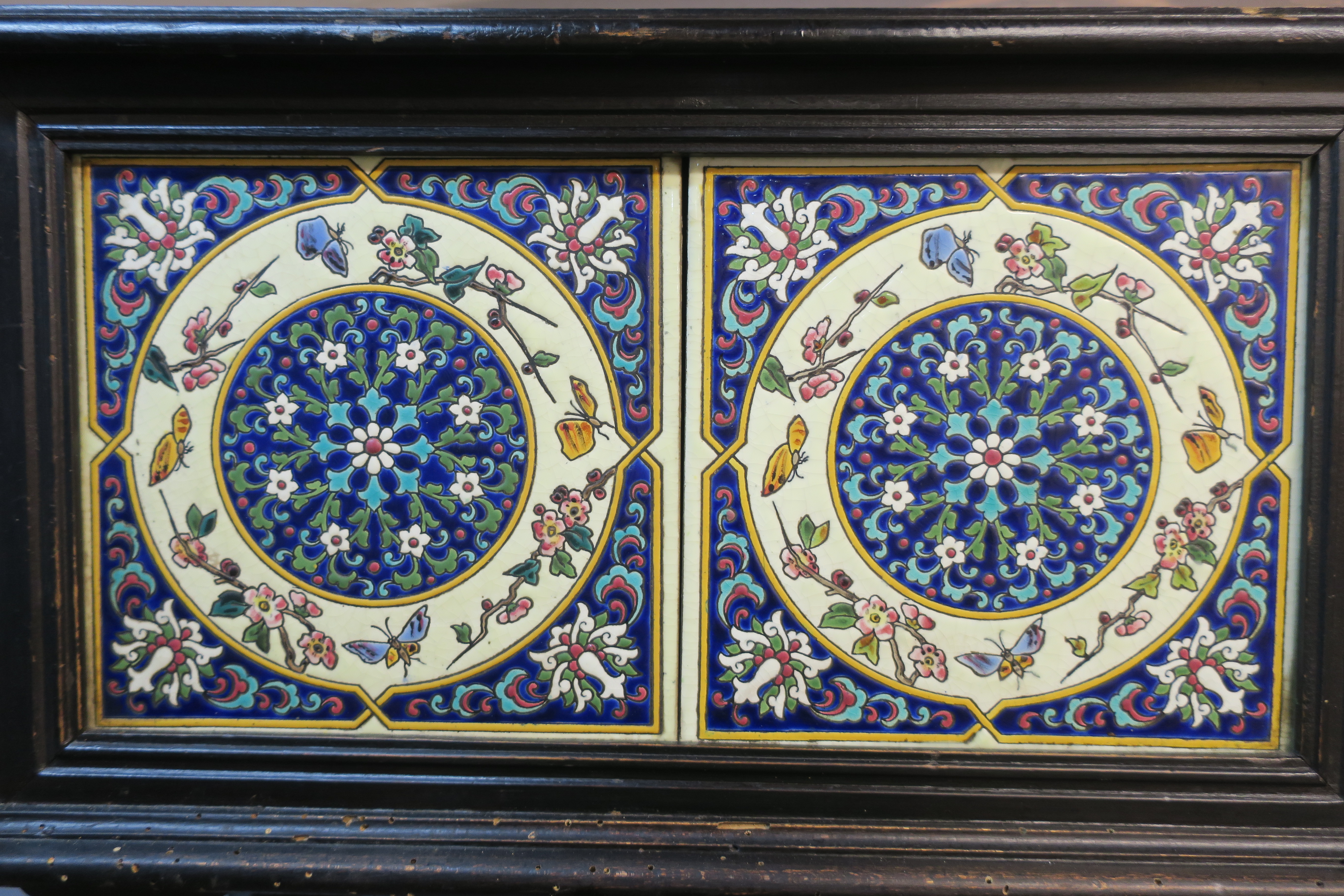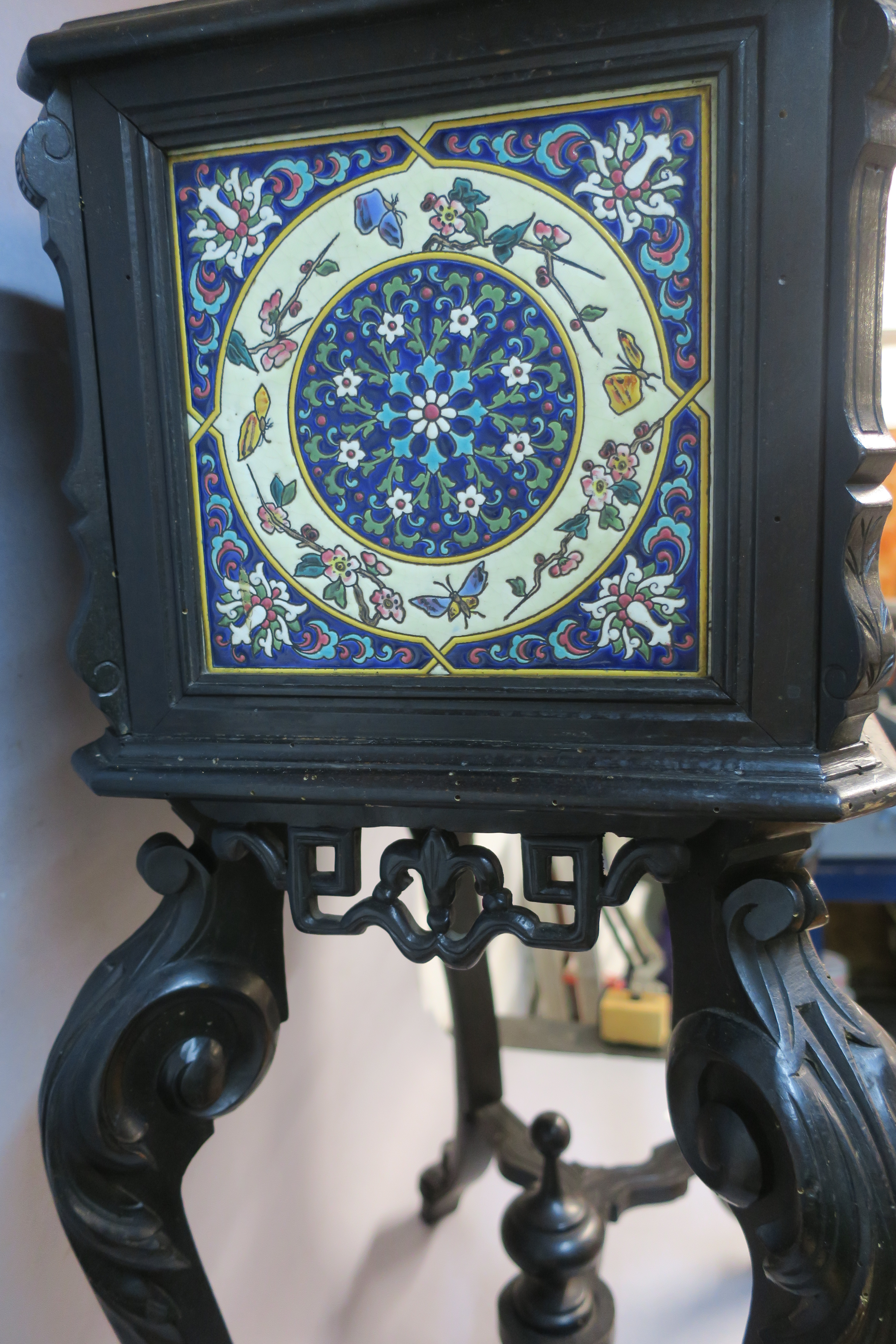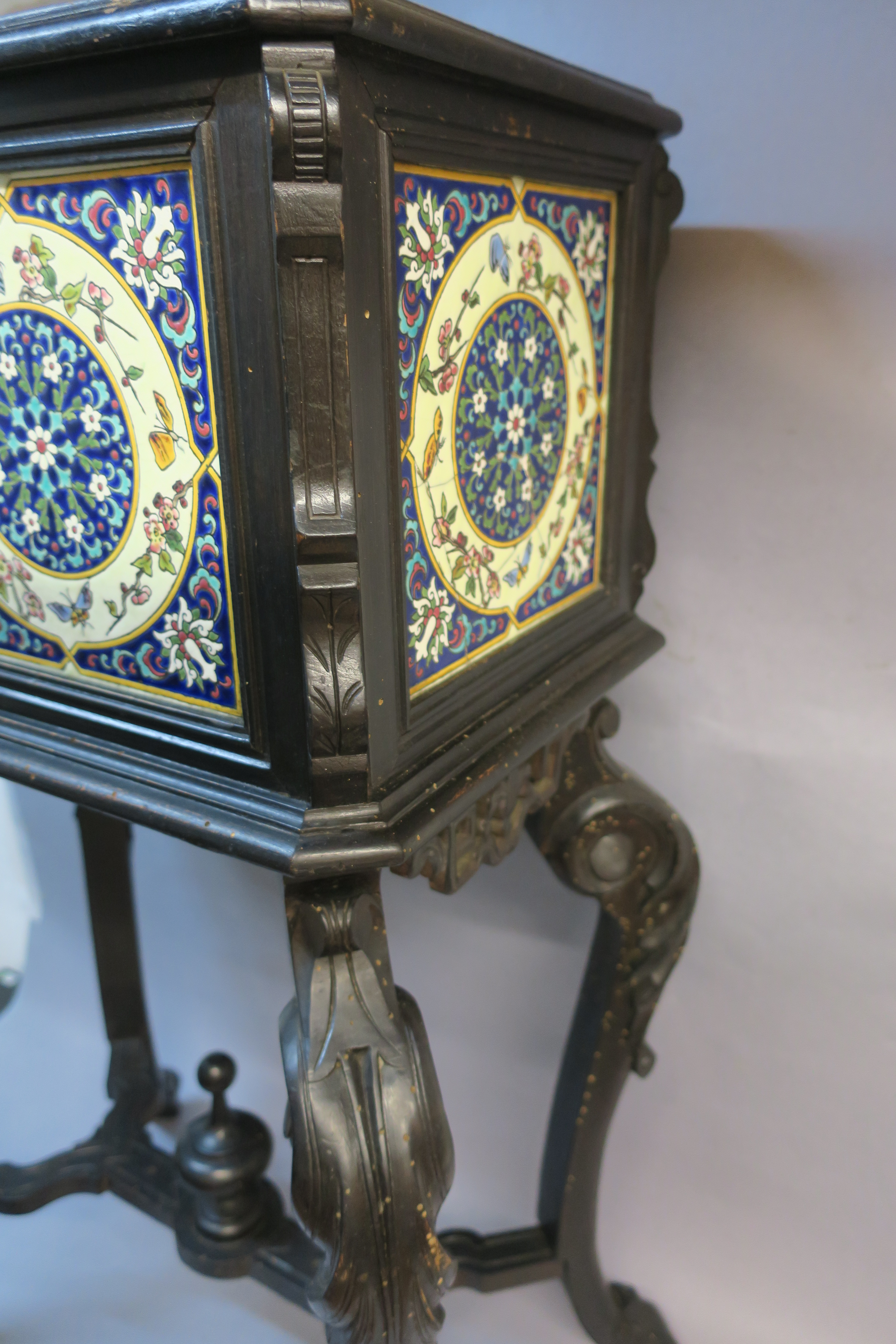 Jardinière sur pieds en bois noirci de style orientalisant, présentant sur trois faces des plaques en faïence émaillée polychromes de la manufacture Jules Vieillard à Bordeaux, à motif de papillons et branches de cerisiers.