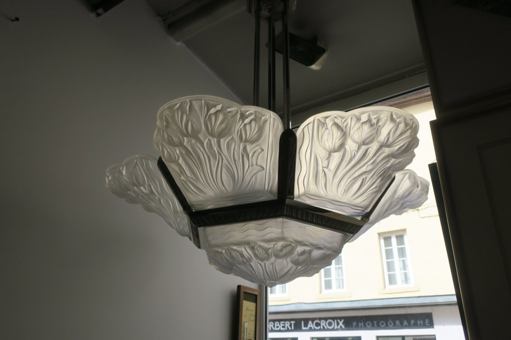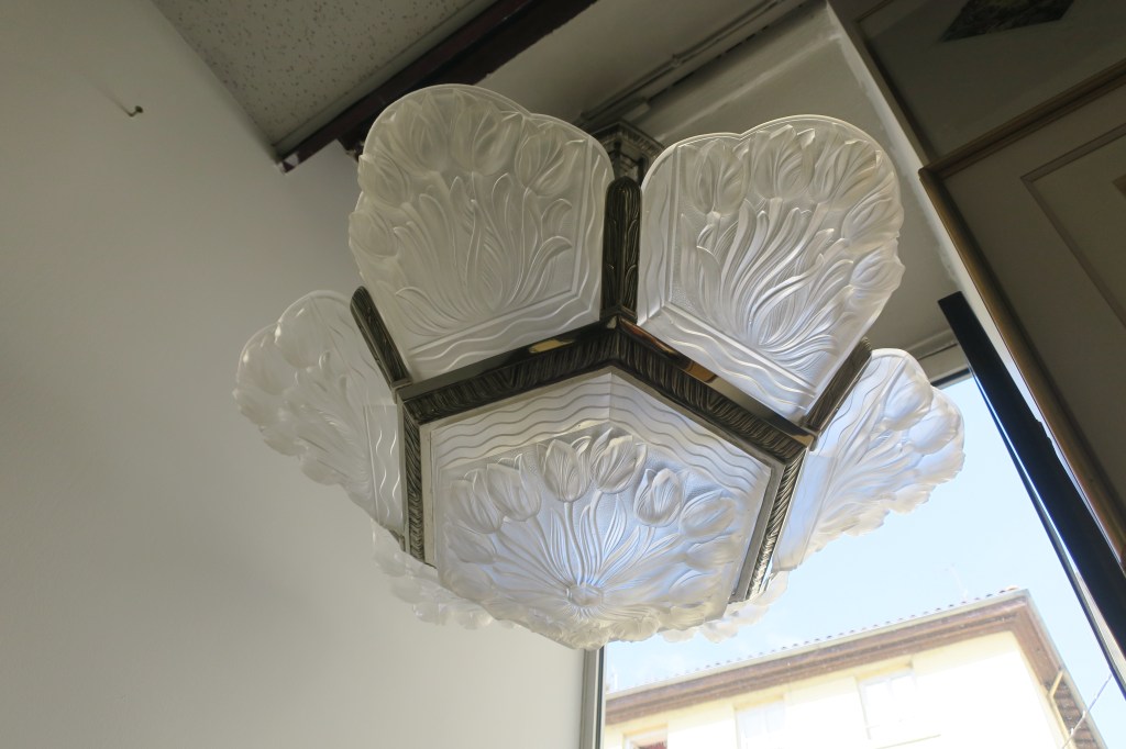 Lustre composé de 6 plaques et une coupe en verre moulé-pressé à décor de tulipes, réunies par une monture en métal ciselé.