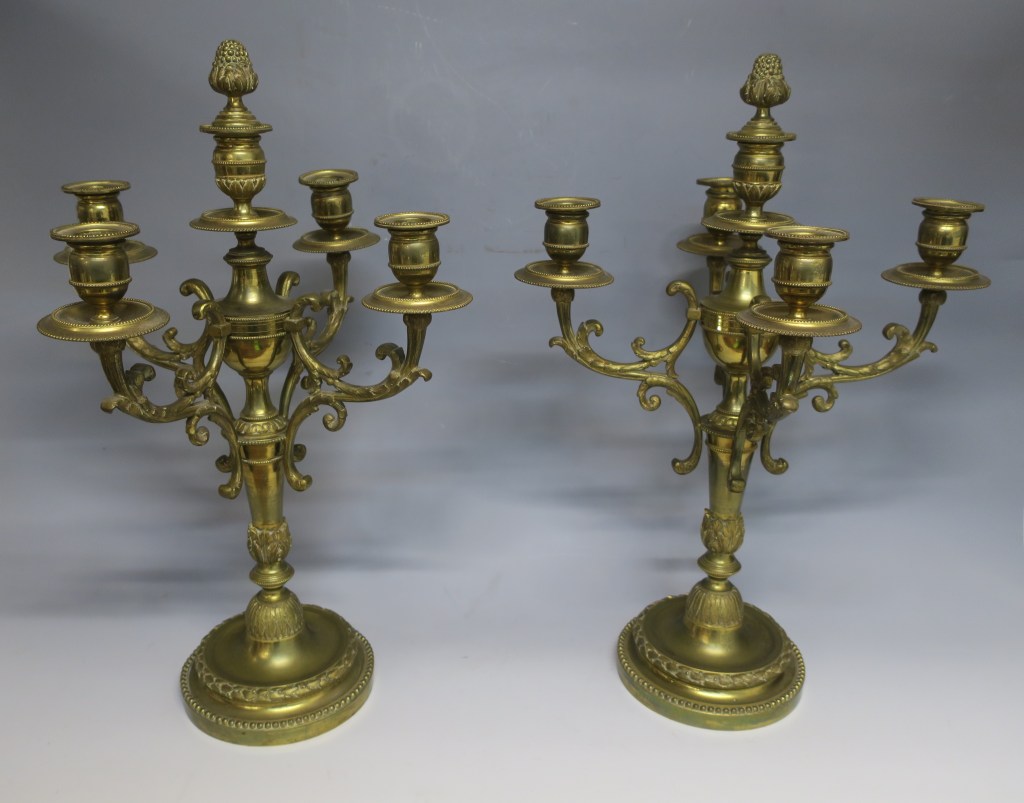 Grande paire de candélabres en bronze doré à cinq lumières, le fût orné de perles, frises de laurier, feuillages. Marqués « HL » sous la base.