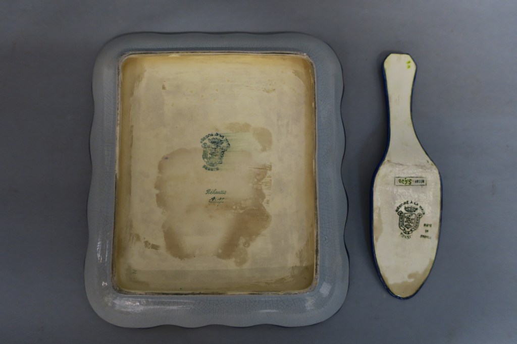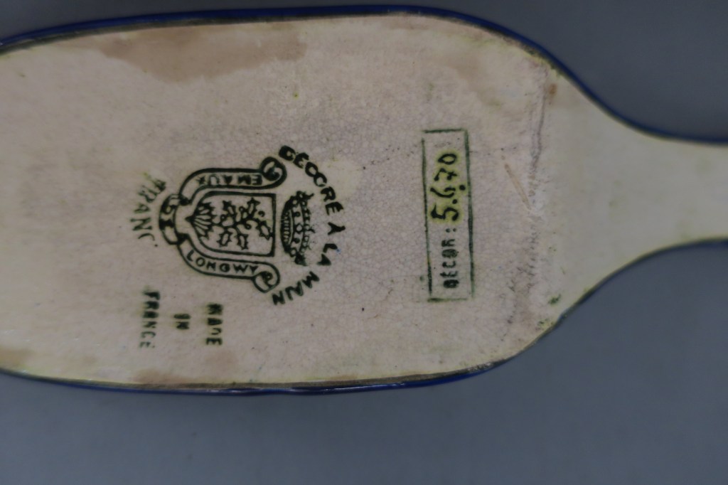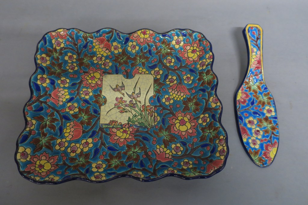 LONGWY. Plat et pelle à gâteaux en émaux polychromes. Décor 5670.