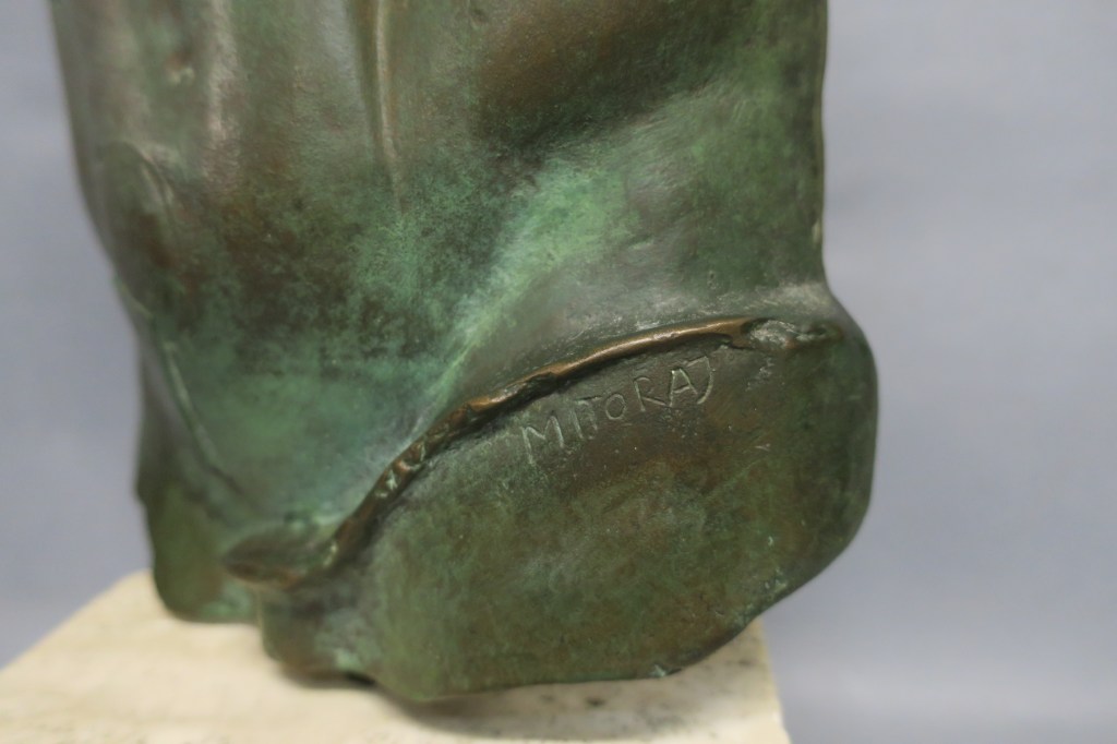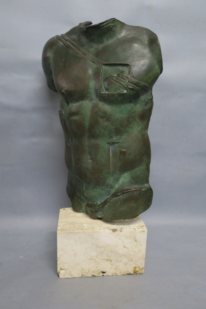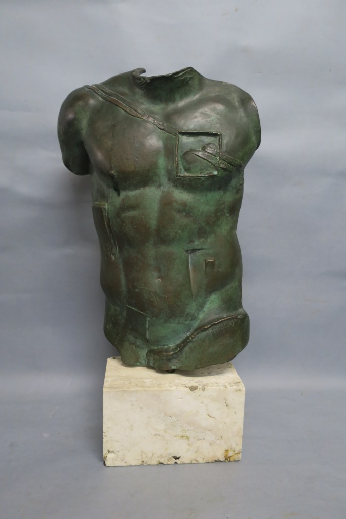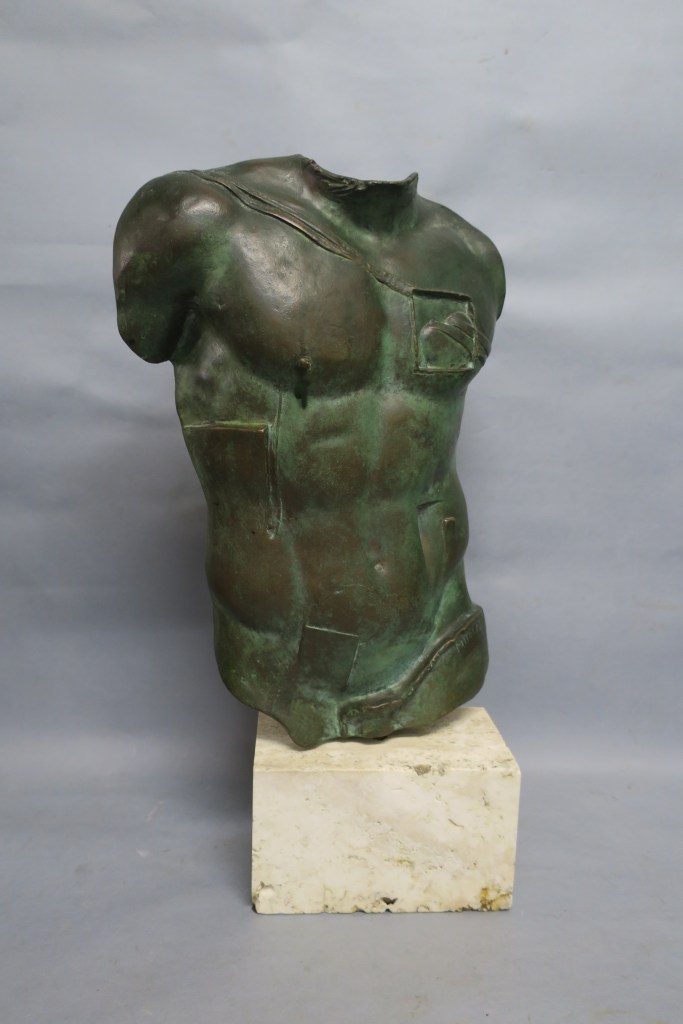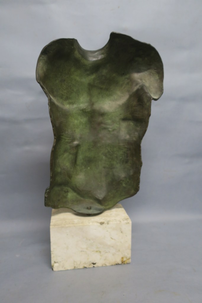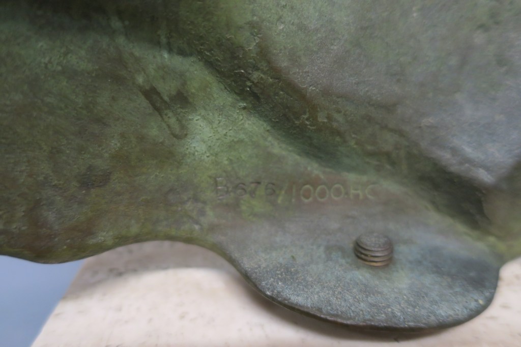 Important bronze à patine vert antique sur socle en travertin. Vers 1988.